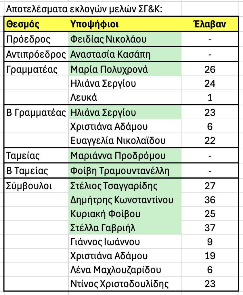 Σας ενημερώνουμε ότι από την εκλογική διαδικασία της Γενικής Συνέλευσης στις 13.10.25 συστάθηκε το Νέο Διοικητικό Συμβούλιο του Συνδέσμου Γονέων και Κηδεμόνων του Ε Δημοτικού Σχολείου Αγλαντζιάς – Άκη Κλεάνθους.